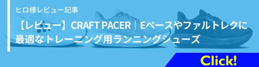 これまで国内外の主要ブランドを数多く履きこなしてきたヒロ様が、次なる相棒として選んだのがCRAFTのPacer。「自分の脚で走る感覚を大切にしたいランナーにとって、非常に優秀なトレーニング用シューズ」と、その実力を高く評価されています。Eペースのロングランからファルトレクまで、日々のトレーニングを支える一足として詳しく解説されています。